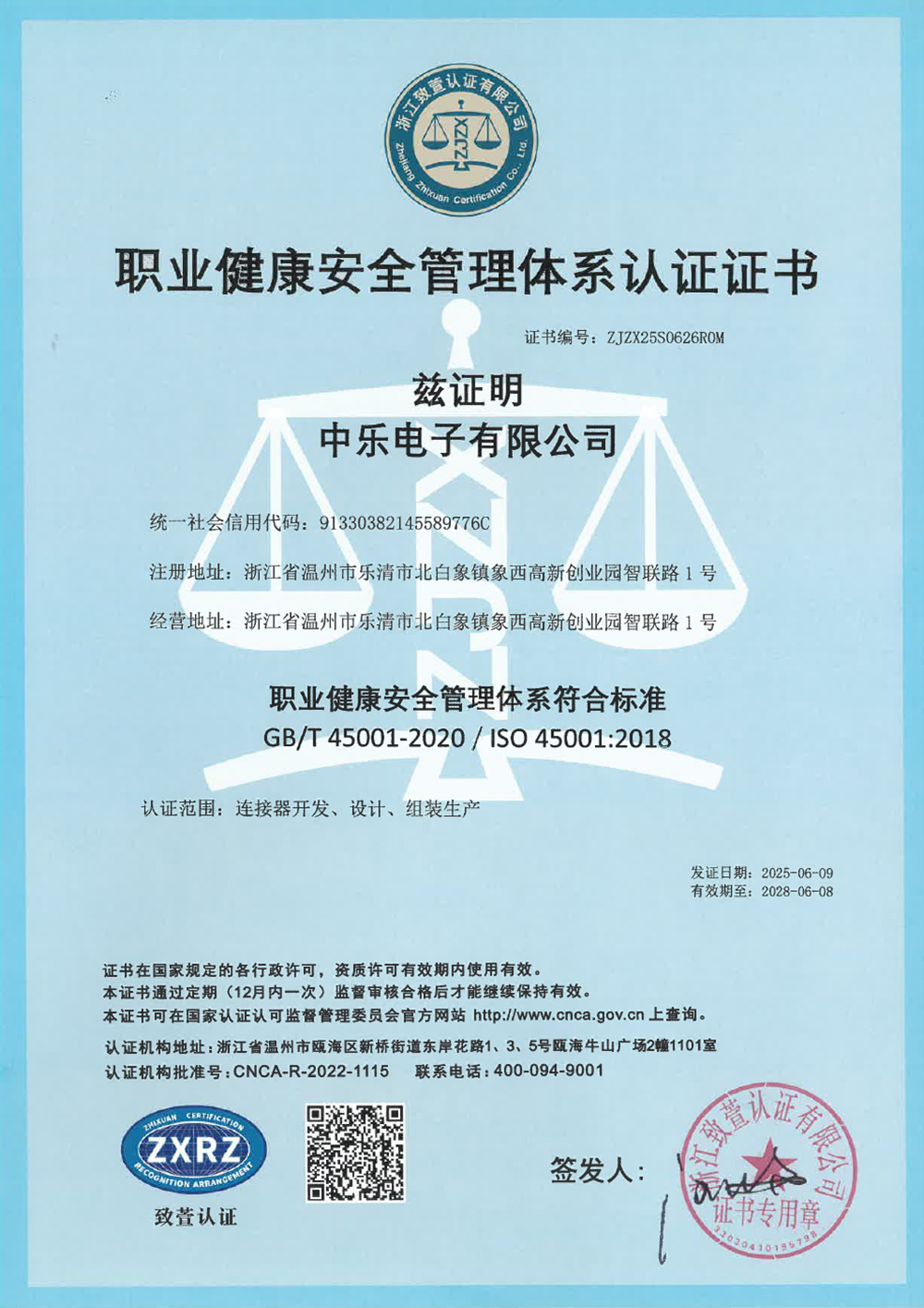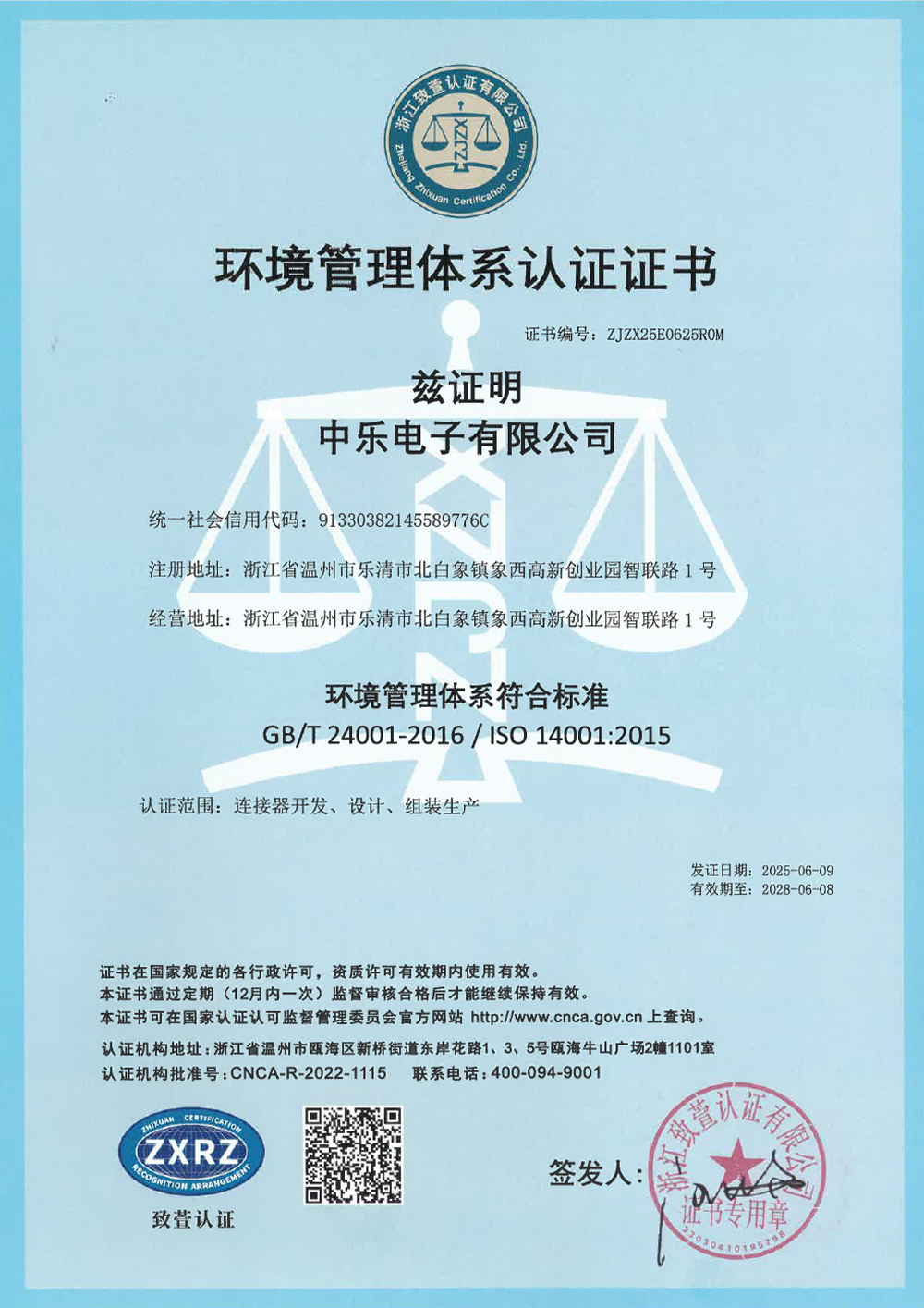 中乐为国家高新技术企业,通过ISO9001质量管理体系认证和ISO14001环境管理体系认证获得中国、欧盟、日本、美国商标注册证书,获得多项实用新型以及外观专利证书,产品认证齐全。